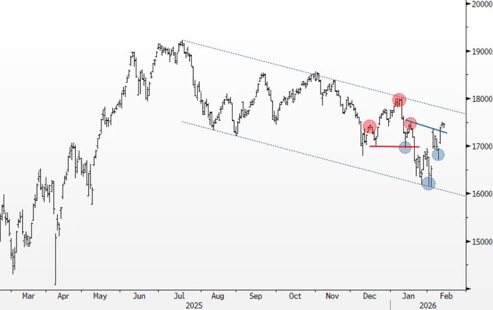 Should bulls be able to hold their ground, first resistance can be seen at the early January highs around 18000, followed by the 18600 area, where the October peak lies. Note that the series of falling highs and falling lows - the classic definition of a downtrend - will only be negated if the index were to climb above this October high.