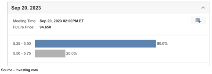 The latest survey on future rate hike pricing shows that expectations of another pause at the September FOMC meeting stand at 80% with only a 20% chance of a rate hike.
