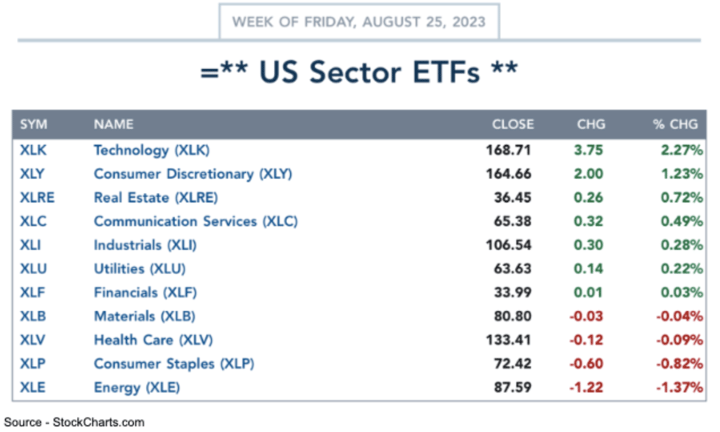 Technology (XLK) was the biggest winner of the week as it gained 2.4%. Other winners included Consumer Discretionary (XLY) and Real Estate (XLRE) with gains of 1.3% and 0.75% respectively.