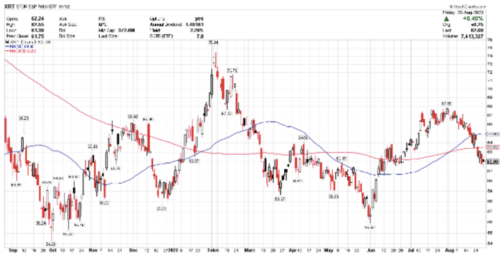 Retail Roundup. It was a busy week for the speciality, mid-sized and mall based retailers. Results were all over the place as the consumer continues to remain more and more selective and the Retail ETF, XRT (chart below), continues to struggle.
