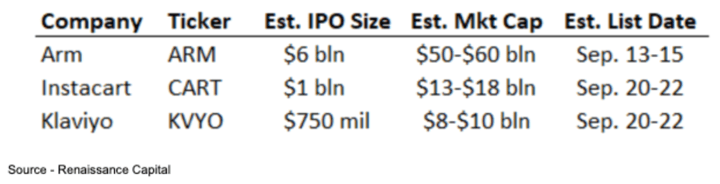 Chip company Arm could be the biggest IPO since Rivian went public two years ago. According to Renaissance Capital it is estimated they will raise over $6 billion. Their roadshow is scheduled to launch after Labor Day. The market’s reaction to this IPO could open a floodgate of other tech companies that continue to wait on the sidelines for a better time to test the market.