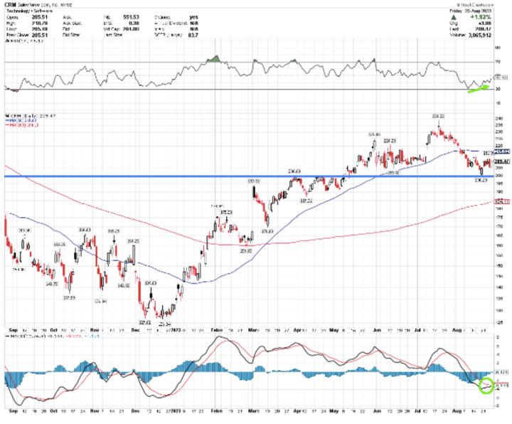 Salesforce (CRM) is the best performing stock in the Dow for 2023 after being the second worst performer in 2022. Shares are up 58% YTD, but haven’t gained much ground over the last three months as it trades just above $200.