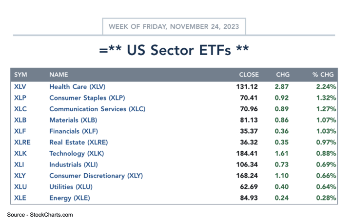 We did see some new leadership last week as the rally broadened out. Real Estate (XLRE) led all indexes for the first time all year with a gain of 4.7%. Other sectors with gains of over 2% on the week included Materials (XLB), Industrials (XLI) and Financials (XLF).
