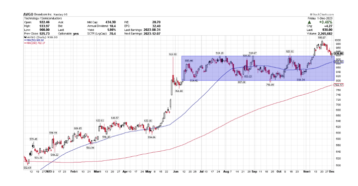 Broadcom (AVGO). Last quarter shares of AVGO traded lower by -5.5% which snapped a winning streak of 10 quarters where the stock traded higher after reporting earnings. Despite the minor set back, shares remain on a tear this year as they are up 66%.