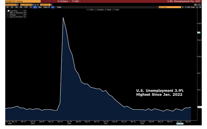 Unemployment Data. On Friday we get unemployment data that should remain inline with last month’s 3.9% reading according to economists consensus estimates. This is the highest level since January 2022, but still near historical lows as seen in the chart below.