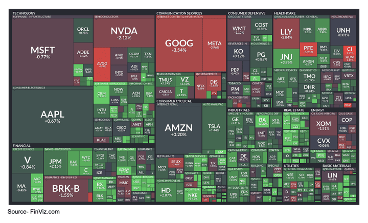 Heat Map. It’s very interesting to see the megacaps in bright red this week, yet the overall indexes were able to climb higher without their participation. Its a true indication of market rotation at work. Alphabet (GOOG) and Meta Platforms (META) were a big drag on the communications sector, but not the overall market.