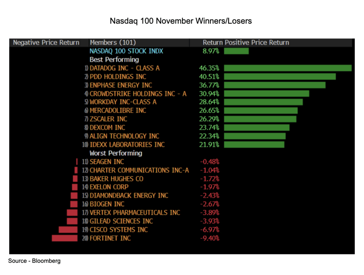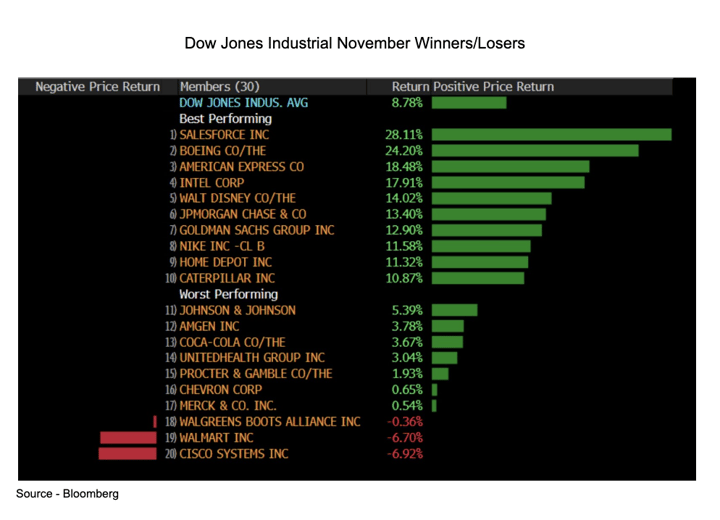 November Stats. It was the best month for the market since July 2022, and one of the best November gains over the last 100 years. Here’s a snapshot of what led the major three indices. The rally was so strong that the Dow only had three of its 30 members lose ground for the month.