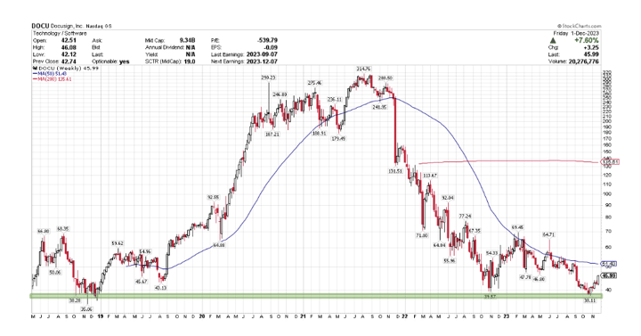 Above is an all-time weekly chart of DOCU. It has failed to trade above its 50-week moving average since December of 2021. Each time it gets near the mark it fails. The range has also narrowed as the stock has a solid level of support around its initial pricing around $39.