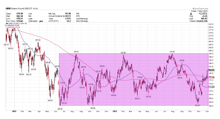 The tailwind of a rate pause and hopes of a cut as the Fed stands pat could keep that momentum going. If so, they may be able to join the other indexes in the new high party. A rally of 4% would equate to its August peak and a rally of 8% would bring it back to the top end of its two-year long range.