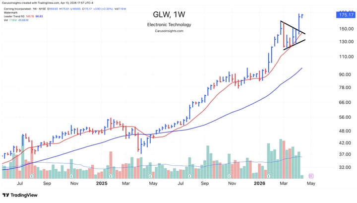 Though Corning (GLW) is one of the oldest American companies, it continues to reinvent itself along with new demands for glass. Much like the 1990s (a reminder to read our 1996 precedent from yesterday’s Market Mosaic), GLW is seeing surge in demand as AI focused datacenters upgrade to GLW’s latest fiber/optical cables as new tech needs faster data transmission speeds.