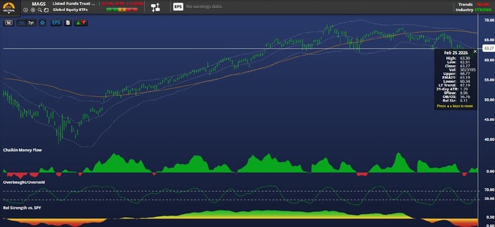 While institutional money flow for the Magnificent Seven complex has maintained structural strength since May, the era of consistent and meaningful relative outperformance versus the SPY appears to have concluded following the prolonged leadership cycle that dominated from July through January. The group is now consistently lagging the broader market indices on a relative strength basis, indicating a decisive rotation away from mega-cap technology concentration and toward alternative market segments. Current price action suggests MAGS is likely to consolidate within a range centered on the $63.00 level as it attempts to stabilize around its 200-day moving average inflection point.