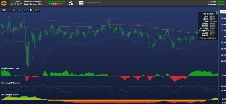 Looking forward, I anticipate a constructive two-week trading window for SPLV with a technical price objective of $77.00 based on the current momentum trajectory and lack of distribution signals. While the RSI readings reflect technically extended conditions, the conspicuous absence of selling pressure suggests that the current momentum is being driven by structural institutional rebalancing mandates rather than transient retail speculation that would typically exhaust more rapidly. Until observable evidence emerges of a breakdown below the neutral 50 RSI threshold accompanied by deteriorating money flow characteristics, SPLV remains the highest-conviction "safety" allocation for systematic traders navigating the elevated post-earnings volatility environment.