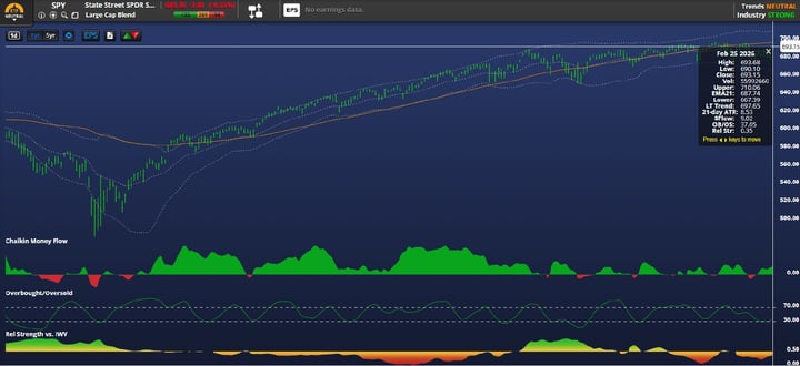 Should the bulls successfully penetrate the 698 resistance level with confirming volume characteristics, technical projections based on the current consolidation range suggest a mid-March price objective in the 705 area. However, internal market breadth dynamics remain a structural concern as capital flows continue their systematic migration away from domestic large-cap concentration and into international equities, low-volatility factors, and alternative market segments. The SPY currently represents a market of individual stock opportunities rather than a cohesive trending environment, necessitating tactical precision in entry and exit execution at the defined range extremes to capture alpha within this constrained trading band.