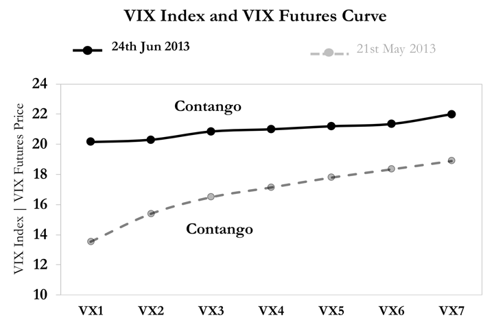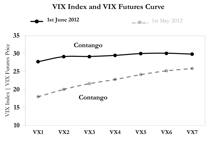 Several authors have noted that volatility implied by VIX futures consistently overestimates actual or realized volatility of the VIX as the futures move towards expiry – particularly when the term structure is upward sloping or in contango. In physical commodities, such as oil, this difference is termed as the “cost of carry”, representing storage, transportation, financing and other charges in a period of low demand and ample supply. However, in the case of VIX futures it is attributable to volatility risk which the buyer of futures is willing to pay the seller.
