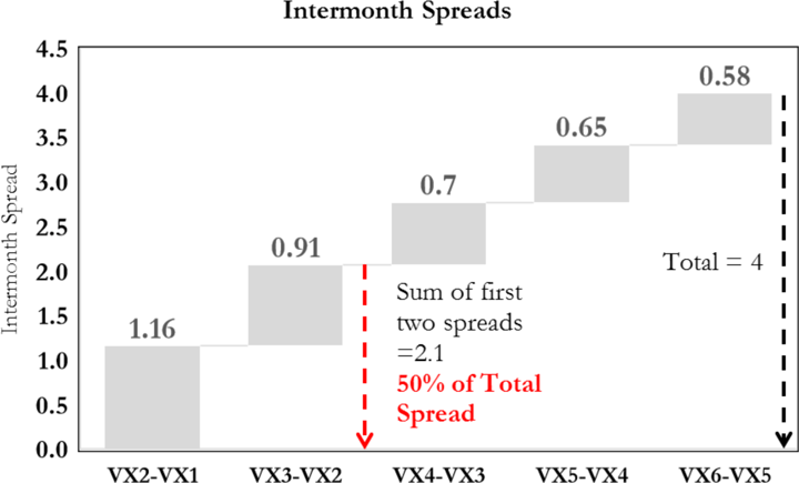 Next, the term structure curvature is examined for the first six quoted VIX futures during this period by calculating the inter-month spreads. These spreads reflect the risk appetite between months and are the highest in the front and taper off towards outer months. The calculated inter-month spreads for the reference structure are shown in Table 1.C in Appendix C, along with key statistics such as maximum, minimum, mean, median and standard deviation. The term structure is non-linear in nature with the spread between the first and the third month accounting for close to 50 percent of the cumulative total of inter-month spreads between the first and the sixth month as illustrated in Figure 3.3.