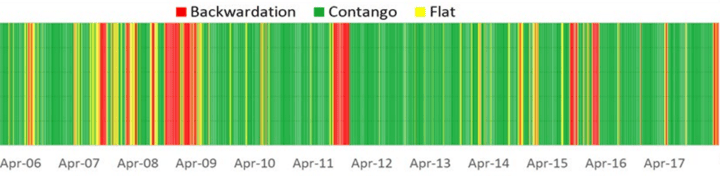 As this risk diminishes in upward-sloping term structure periods (which Asensio estimates to be 75 percent of the time), the seller collects the premium, as long as the term structure is retained to front month contract expiry.