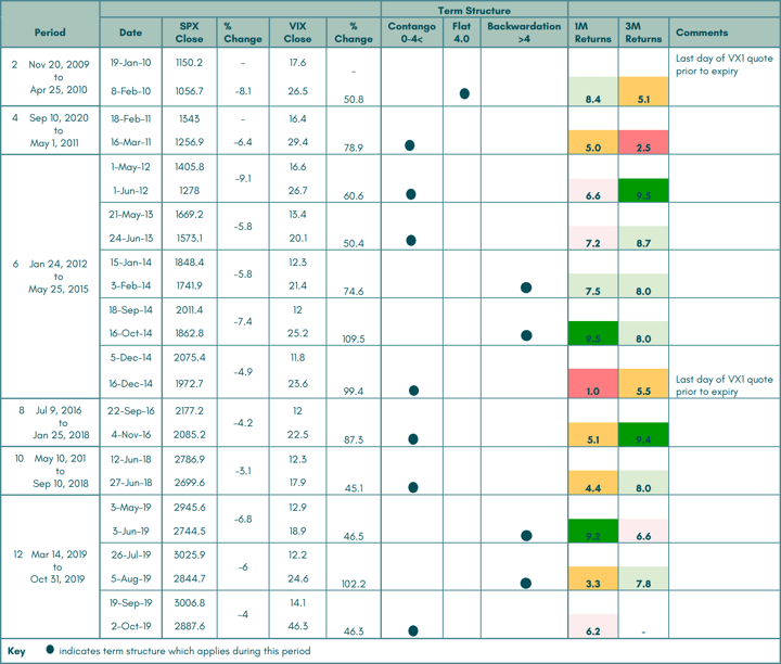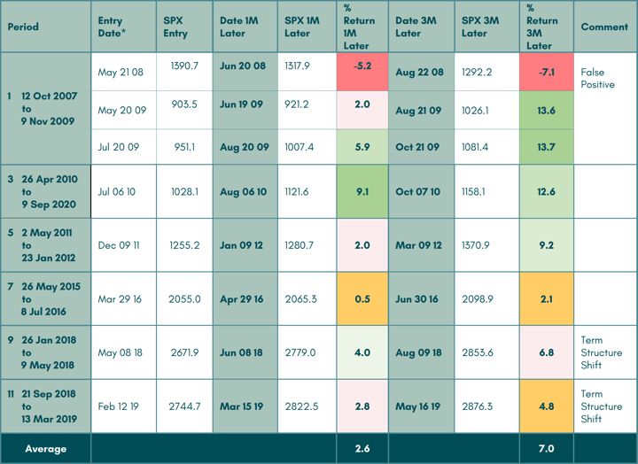 The color coding of the value enables identification of the various regimes that the data traverses. The end of a correction, or bear market, results in VIX returning close to or below threshold values and VRS returning below threshold to at or near its reference term structure. Furthermore, this tool can be used to identify suitable entry points to the long side upon VRS returning back to the reference term structure or close to it – confirming an upward sloping term structure. Examples of these instances and associated returns for one and three months forward are shown in Table 2 below for all periods examined.