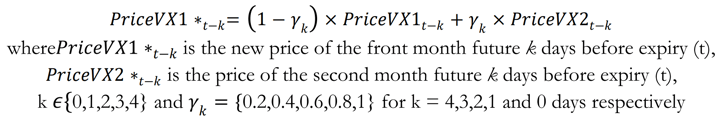 To determine outliers and erroneous values, a data check was done using Refinitiv Datastream as a separate source. No major outliers were identified, and no data cleaning was required. Convergence of first month futures with the VIX near expiry was handled by implementing the following data smoothing step. Starting five days prior to expiry (t) of each front month future (VX1), its price was recalculated as follows (1):
