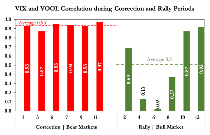 Figure 4.2: VRS and VIX Correlation during correction / bear market periods (red) and rally/bull market periods (green)