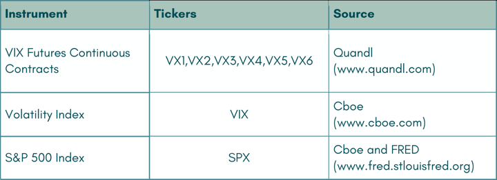 The data used for analysis in this study was obtained from Quandl, Cboe and the Federal Reserve Economic Data (FRED). Table 1 below lists the source of each instrument.