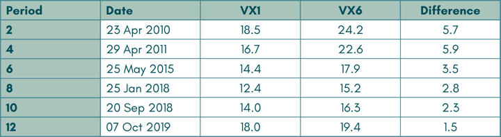 It may be noted that the return of the term structure to its reference is seen to overshoot it during periods 1,3 and 5 while undershooting it during periods 7, 9 and 11. This could be explained by the changing nature of the term structure prior to and after the reference period. An examination of the difference between first- and six-month futures for the various upward sloping periods 2, 4, 6, 8, 10 and 12 was done using the date of the highest high prior to onset of the subsequent correction. The results are shown in Table 3. These dates were chosen as they serve as the best representation of an upward sloping reference term structure in each instance. The results confirm that while the sixth-month futures – representing a longer-term expectation of the level of the VIX– had declined from 24.2 to 19.4 since the bear market of 2008-09, the term structure had indeed become flatter with time during the study period; this is shown by the difference between VX1 and VX6 in the last column. An adjustment for this shift can be made to this tool by dynamically moving the reference term structure period to a more recent rally period preceding the period being analyzed. A similar principle could be applied to establish the VIX threshold due to the changing nature of the VIX average as noted in Appendix A.