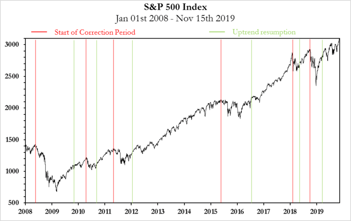 - Identifying suitable market entry points during the end of bear markets/corrections exceeding 10 percent.