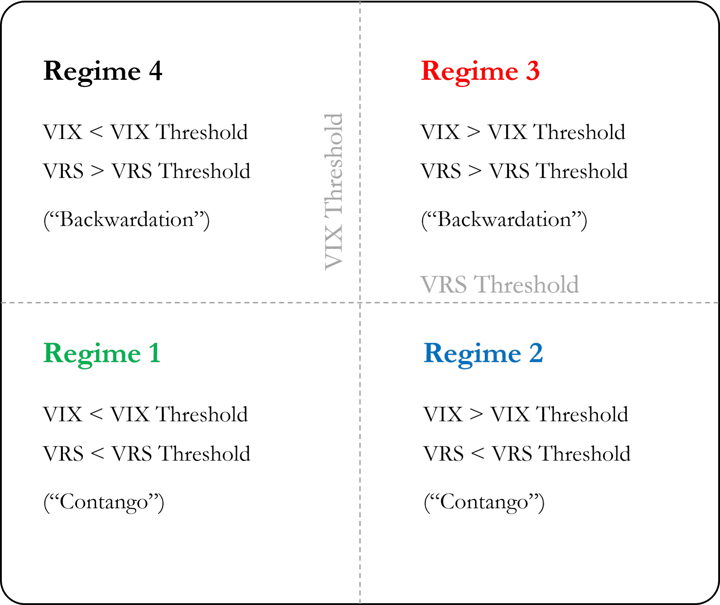 For example, when VIX and VRS are both below their thresholds (“Regime 1”), low volatility conditions prevail enabling rallies. Similarly when VIX and VRS are both above their thresholds (“Regime 3”) volatility remains high both in the present and future resulting in market corrections driven by risk aversion. “Regime 2” represents conditions where VIX is above its threshold, however, VIX futures remain upward sloping (contango) thereby establishing a divergence with the VIX. These situations could present possible market entry opportunities. “Regime 4”, representing a situation where the VIX is below its threshold and the VIX futures is downward sloping (backwardation). This is unlikely to occur in practice.