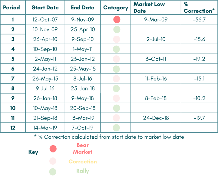 - The period selected in 2 above is highlighted in the chart in the upper right-hand corner. Correction/Bear markets are highlighted in red and rallies in green.