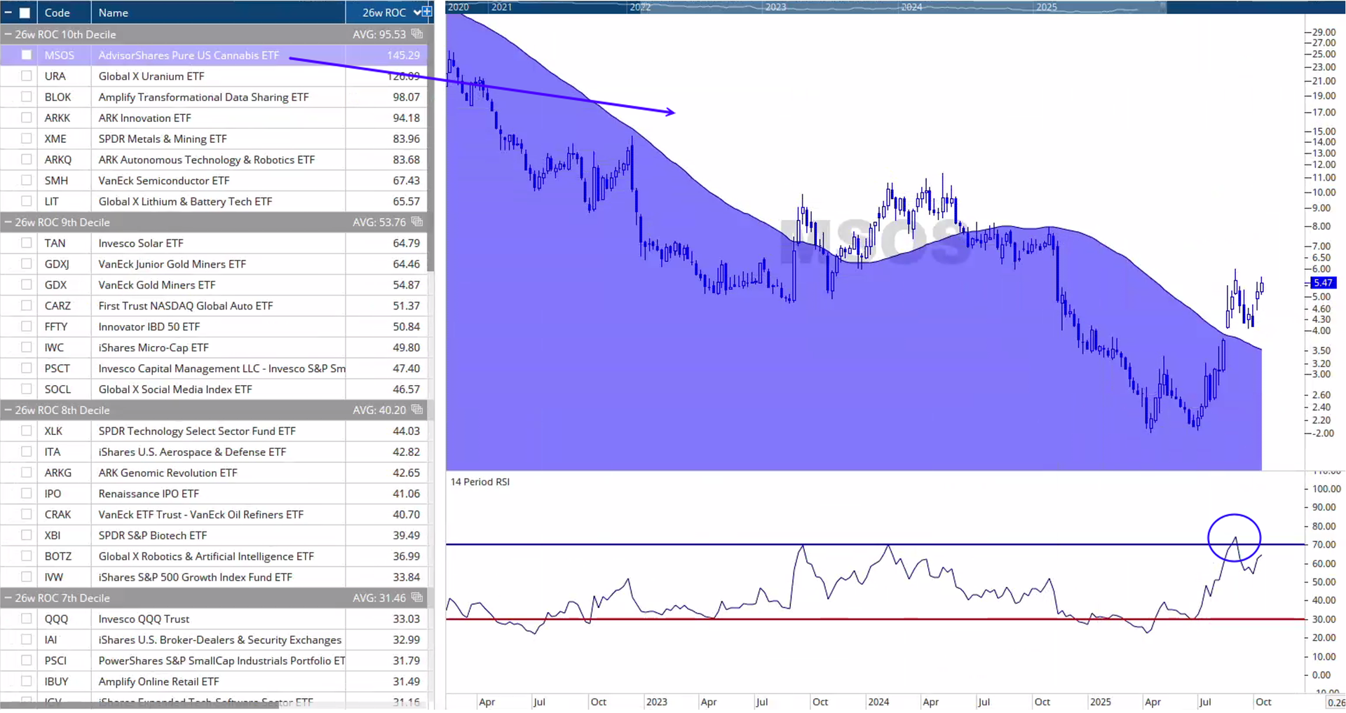 Below is a 26-week rate-of-change scan on an inventory of domestic ETFs, broken down by decile with a weekly chart at the right, and RSI (a momentum indicator) below the chart.