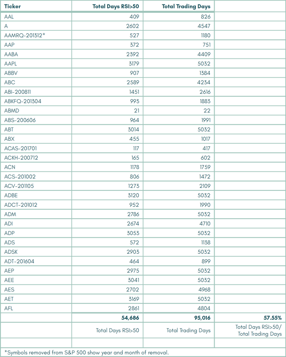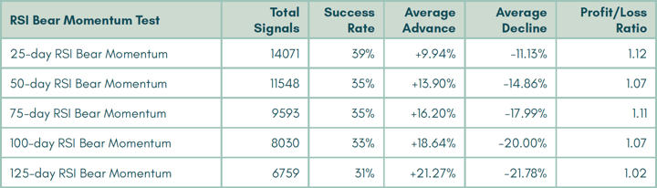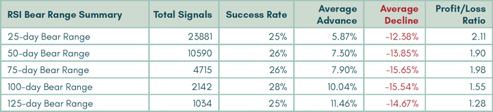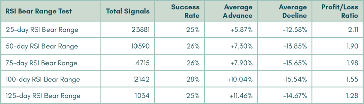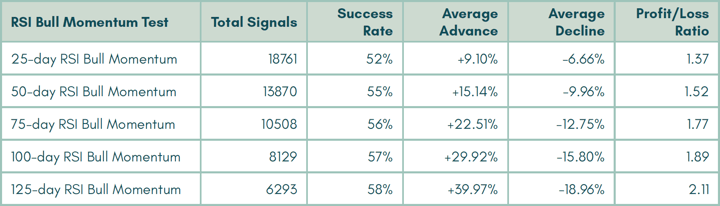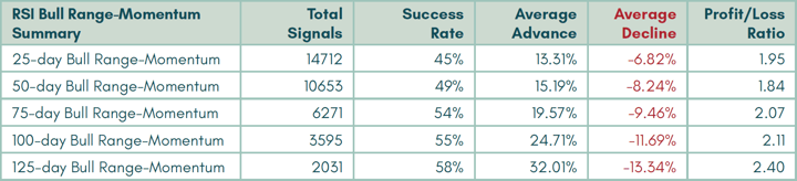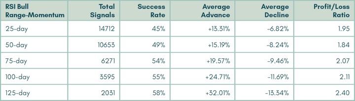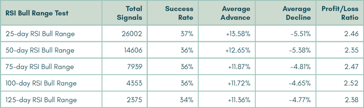 Each test group covers five lookback periods (N days): 25, 50, 75, 100 and 125 (trading days). For example, the 25-day RSI Bull Range test triggers a signal when 14-day RSI has fluctuated between 40 and 100 for at least 25 days; the signal ends when RSI moves below 40, breaking the range. The next test, 50-day RSI Bull Range, triggers a signal when 14-day RSI has fluctuated between 40 and 100 for at least 50 days; the signal ends when RSI moves below 40.