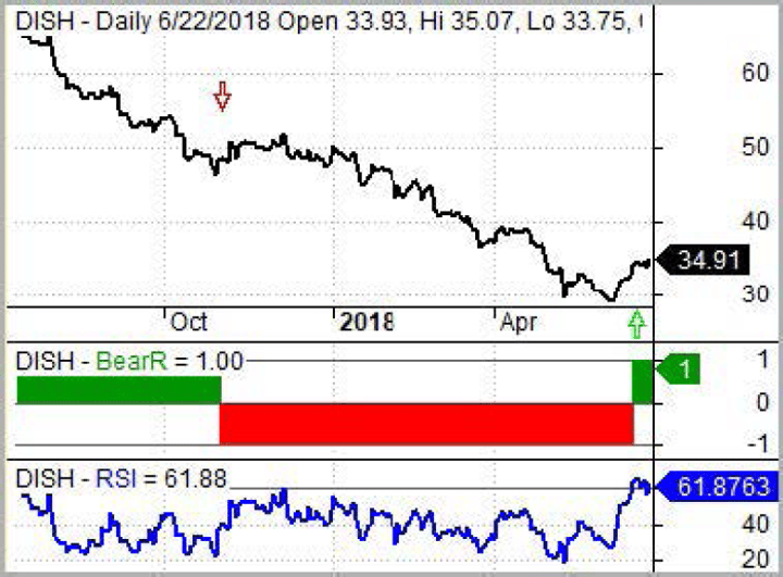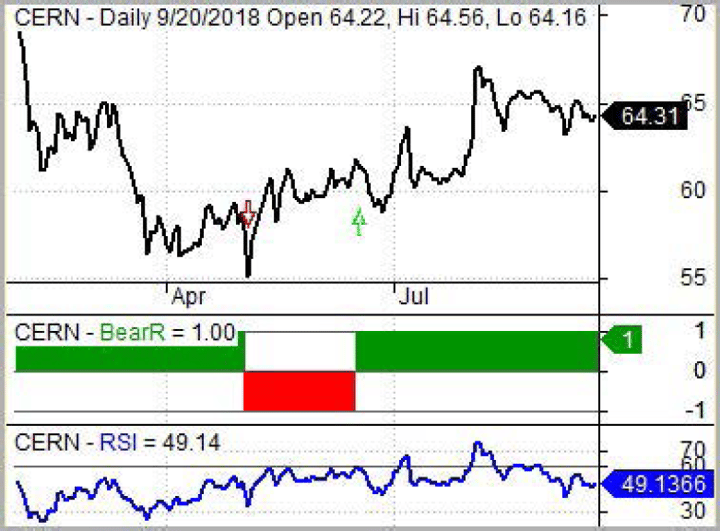 Chart 10 shows Dish Network (DISH) with the 75-day RSI Bear Range indicator and RSI with a horizontal line at 60. The RSI Bear Range indicator moves to -1 (red) when RSI does not move above 60 for a least 75 days. This bearish signal (red arrow) remains in play as long as RSI fails to break above 60. The indicator moves to +1 (green) when RSI moves above 60 and breaks the range (green arrow). DISH declined 30.4% for a successful bearish signal (profit). Chart 11 shows a failed bearish signal (loss) for Cerner (CERN), which subsequently advanced 17.7%.