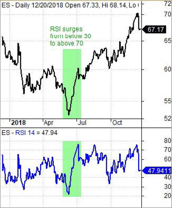 Practitioners have also found that high RSI levels can be bullish and lead to further price gains. In a presentation to the CMT Association, David Cox, CMT, CFA, showed how a surge above 70 can signal the start of a new uptrend. After an extended downtrend and RSI values below 30, an RSI surge above 70 reflects a clear shift in price dynamics. Using Apple (AAPL) as an example, Cox showed RSI moving from a deeply oversold condition to an overbought condition. Chart 6 shows this downtrend reversing to an uptrend when RSI surged above 70, which showed strong upside momentum. Chart 7 shows Eversource Energy (ES) becoming “oversold” as RSI dipped below 30 in February and June 2018. The sharp move from below 30 to above 70 signaled a clear shift in momentum and further gains followed.