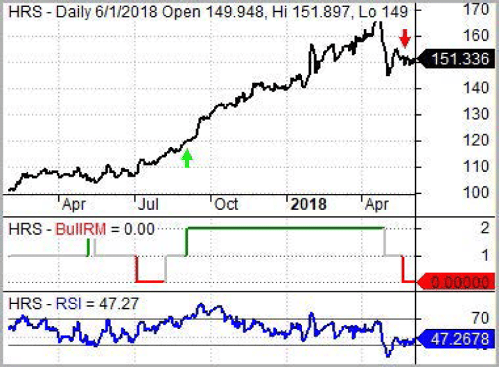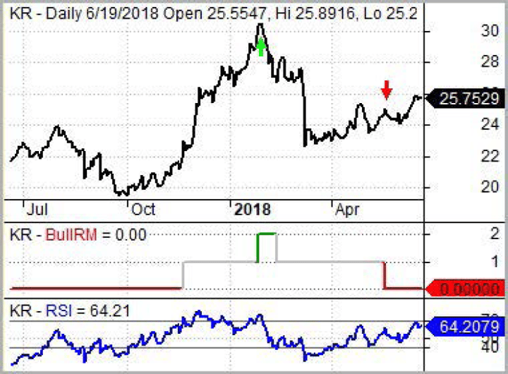 A move to 2 generates an entry signal that remains in effect until BOTH indicators reverse their signals. This means the lowest low value of RSI dipped below 40 and the highest high value of RSI did not exceed 70 over the 75-day lookback period (indicator turns red). The trend lost consistency because RSI broke the bull range AND stopped showing strong upside momentum because RSI failed to exceed 70. Chart 16 shows Harris Corp (HRS) advancing +26.8% for a successful bullish signal (profit). Chart 17 shows Kroger (KR) declining 16.7% for a failed bullish signal (loss).