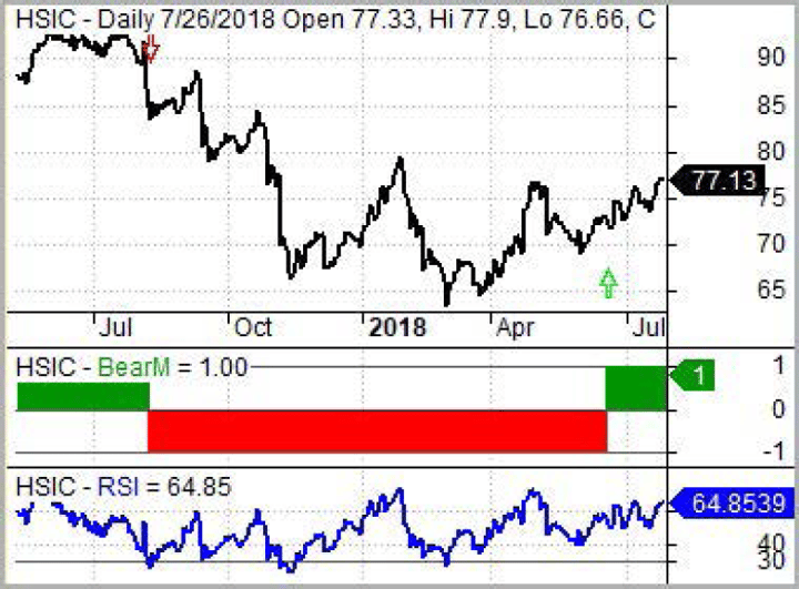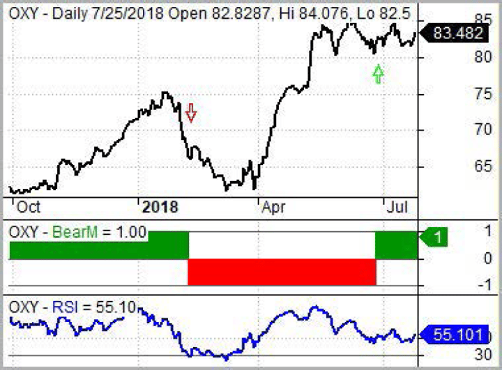Chart 14 shows Henry Schein (HSIC) with the 75-day RSI Bear Momentum indicator and RSI with a horizontal line at 30. The indicator moves to -1 (red) when the lowest low of RSI is below 30 over the last 75 days. This triggers a bearish signal that lasts until RSI fails to move below 30 over a 75-day period. An ending signal occurs when the RSI Bear Momentum indicator moves to +1 (green). HSIC declined 14.3% for a successful bearish signal (profit). Chart 15 shows Occidental Petroleum (OXY) advancing 23.7% for a failed bearish signal (loss).