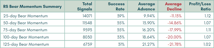The Bear Momentum results (BearM - red circle) appear in the lower-left quadrant because they have the lowest Profit/Loss Ratios and relatively low Success Rates. The Bear Range results (BearR - triangle) are also mostly in the lower left quadrant because of the low Success Rates (below 30%) and the relatively low Profit/Loss Ratios. Only the 25-day Bear Range signal showed a Profit/Loss Ratio above 2.