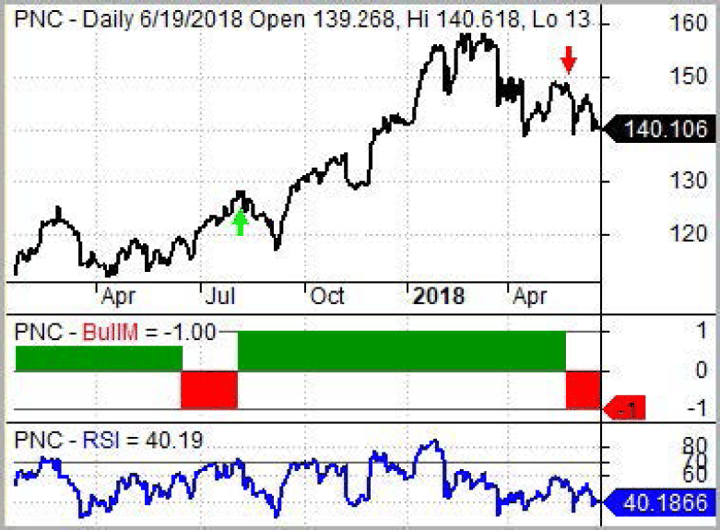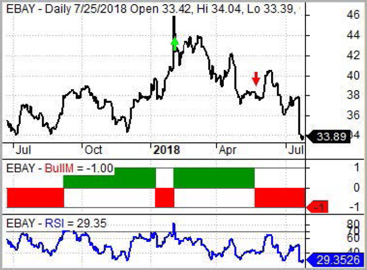 Chart 12 shows PNC Financial Services (PNC) with the RSI Bull Momentum indicator and RSI with a horizontal line at 70. The RSI Bull Momentum indicator moves to +1 (green) when RSI exceeds 70 and remains at 1 as long as the highest high of RSI is above 70 over the lookback period, which is 75 days. The indicator moves to -1 (red) when the highest high of RSI fails to exceed 70 over a 75-day period. PNC advanced 15.4% for a successful bullish signal (profit). Chart 13 shows eBay (EBAY) declining 15% for a failed bullish signal (loss).