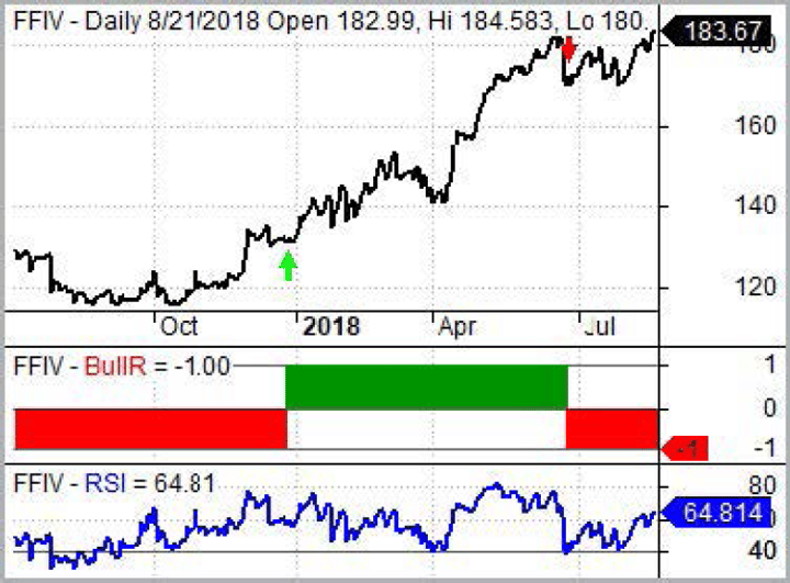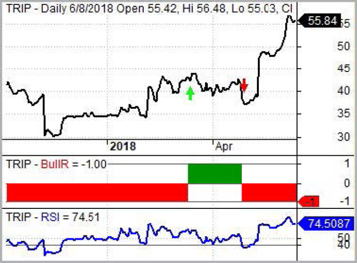 Chart 8 shows F5 Networks (FFIV) with the 75-day RSI Bull Range indicator (red/green) and RSI (blue) with a gray line at 40. The RSI Bull Range indicator moves to +1 (green) when RSI fluctuates between 40 and 100 for at least 75 days. The indicator moves to -1 (red) when RSI moves below 40 and breaks the range. The green arrow shows the beginning signal and the red arrow shows the ending signal. FFIV advanced 29.9% after the bullish signal for a success (profit). In contrast, Chart 9 shows a failed bullish signal (loss) for TripAdvisor (TRIP), which fell 11.1% between signals.