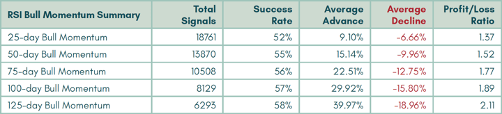 Taken together, the evidence shows that RSI range and momentum signals can foreshadow sizable advances with a good success rate, especially when the lookback period extends from 75 to 125 days. The RSI Bull-Momentum signals were less successful at the 25-day and 50-day lookback periods, which suggests, perhaps, that there is some short-term mean-reversion at work. The performance metrics improved dramatically as the lookback period extended from 75 days to 125 days, which covers periods from three-and-a-half to six months. These longer lookback ranges point to a trend-momentum sweet spot that investors can use to profit and outperform.