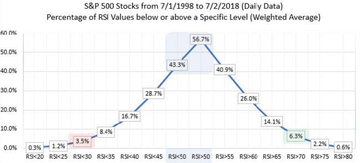 The distribution of RSI values confirms the 20 year uptrend in stocks and the uniqueness of values above 70. Threshold testing reveals that the majority of RSI values exceeded 50 for stocks in the S&P 500 from 7/1/1998 to 7/2/2018. In fact, Chart 5 shows that 56.7% of RSI values exceeded 50 during this twenty-year test period, while 43.3% were below 50. These numbers make sense because the S&P 500 Total Return Index advanced 247%, generating a 6.4% compound annual return, over this same period. The S&P 500 was also above its 200-day simple moving average 70% of the time.