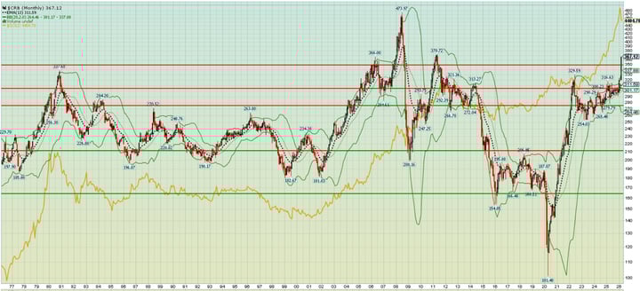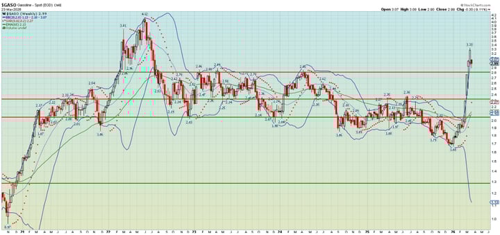 Much of this answer depends on the war but there is also an element of the financial system and global commodities. This chart of the CRB shows that the index just blew past the 1980 levels (as crude and gold were both climbing) as well as the 2005 high, which was the first wave higher for the commodity rally 20 years ago AND a spike high in the Chinese Shanghai Composite (hmm). If the CRB falls back below 350, I would be ready to say that commodities will not be an issue. If it sustains, cost pressures will rise and gasoline will remain in that upward window pushing the cost to drive higher.