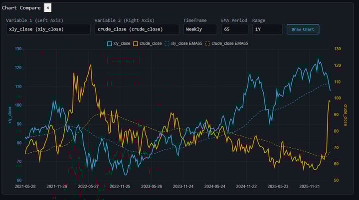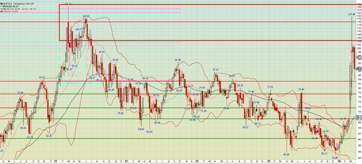 Another ETF that has hit the skids this year is the XLY (Consumer Discretionary). Heading into the latest spike, the XLY was actually doing ok, rising, albeit in a choppy fashion as the price of energy remained in the doldrums. The threats of Crude breaking over the 65-week seemed to cause issues with the XLY only to be unwound and see the rally continue (will they or wont’ they attack Iran?). The latest decline began before the war began as the XLY started to roll as crude hit a low. It was a simple move by crude to climb, as I show in the next chart, but led to a significant decline from high to low in the XLY.