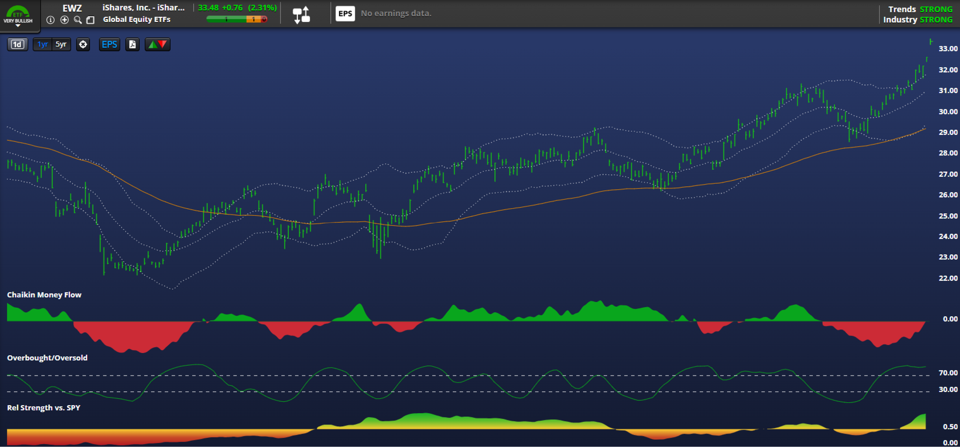 That $29.00 mark proved to be pivotal, as the ETF’s slip back to that price in October successfully retested the rising 200-day support before reversing higher. Notably, EWZ has not registered an oversold reading since the ugly bear market bottom in December when it bottomed at $22.00, underscoring the resilience of its recent uptrend. This current momentum, however, finds the ETF significantly extended, placing it outside of typical short-term comfort zones and indicating an imminent need for consolidation.