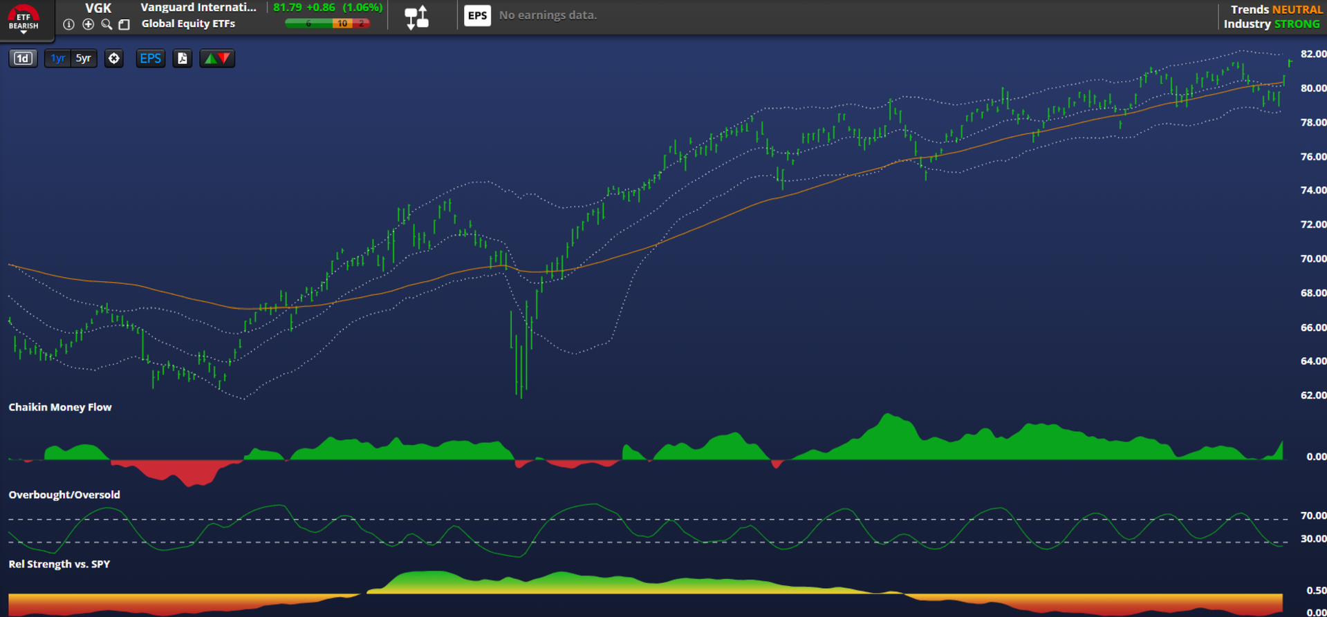 The European market rally continues, with the Vanguard FTSE European ETF (VGK) achieving new 52-week highs on a significant momentum pickup. The foundation for this sustained move was laid in May with a powerful breakout above the $73.50 level, which coincided with an initial overbought reading. This established a bullish stair-step pattern, leading to higher monthly closes near $79.00 in July and $81.00 in October, placing the ETF now on the precipice of $82.00.