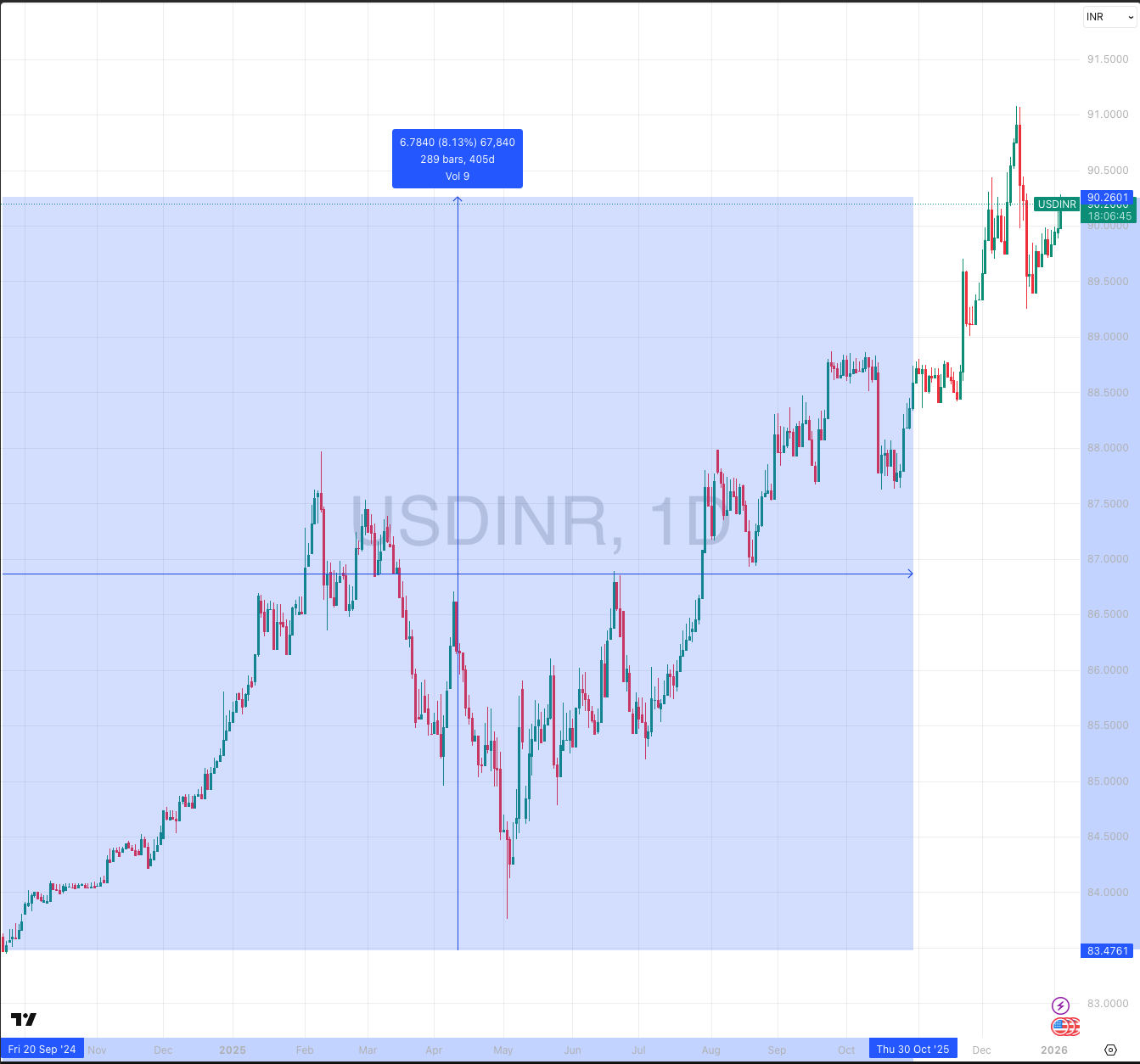 The gap becomes even more telling when you overlap Nifty returns with USD/INR. Currency Drag: The INR fell by over 8% since September 2024, recently breaching the 90 level against the Dollar. The Result: For a global investor, the 10.5% domestic gain in 2025 was almost entirely wiped out by currency depreciation, resulting in a near-zero or negative return in Dollar terms in 2025 and a negative return compared to the peak of 2024.