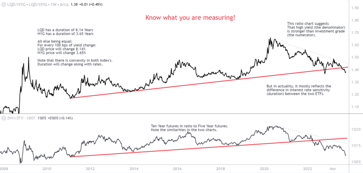 It’s extremely important that you know what you are measuring. A good example is the change in the ratio between investment grade bonds (LQD) and high yield bonds (HYG). A quick glance at the chart might suggest that High Yield is weakening relative to Investment Grade. The easy conclusion would be that fundamentals in the high yield sector were deteriorating and investors were exiting HYG. While fundamentals are modestly deteriorating in HYG more quickly than in LQD, the dominant driver is the difference in duration between the two sectors. This can be seen when running the ratio between ten year and three-year treasuries and comparing it to LQD/HYG.