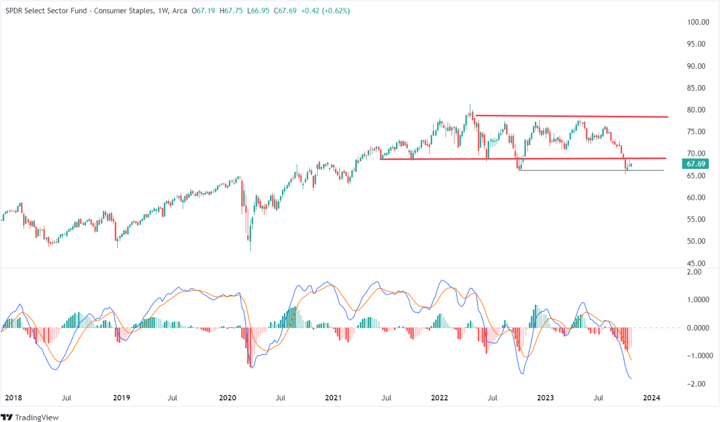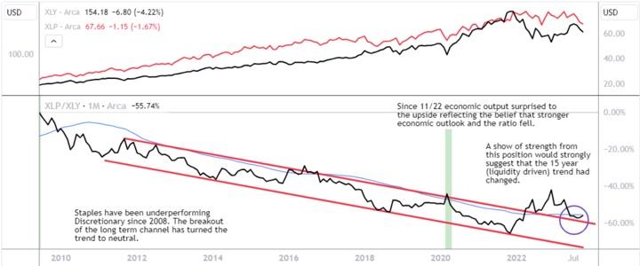 I believe that the long outperformance of discretionary relative to staples is mostly due to the massive liquidity added to the system since the great financial crisis. The liquidity that has aided consumers and thus the economy in general. As liquidity normalizes and the economy slows, staples should begin to outperform discretionary.