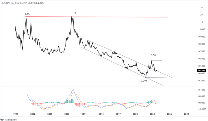 Over the last few months, as the outlook improved and the economic narrative changed to soft landing, the ratio has again turned lower and is now testing the area of the broken trendline that defined the broad down sloping channel.