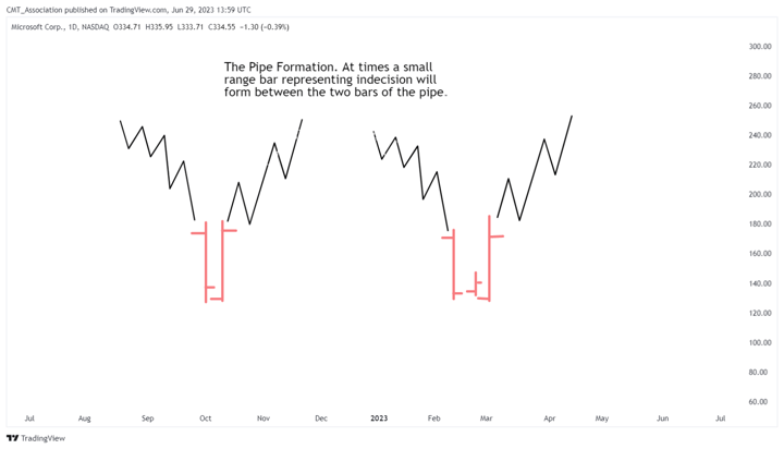 Pipe reversals, like many other traditional patterns, have become less common, but are still important features. Bulkowski in his excellent “Encyclopedia of Chart Patterns” makes the point that pipes are more compelling when they show up on the weekly chart, but in my experience that is true of all reversal patterns (the higher the perspective the more reliable the pattern). The pattern consists of two adjacent upward/downward price spikes into fresh territory with only small relative differences between the bar extremes. The bars should be wide-ranging and should easily stand out from the rest of the trend. There is usually a trend acceleration associated with the pattern. In some cases, there will be a small range bar separating the two wide range bars (the pipes). I am particularly interested when this small range bar generates well above average volume.