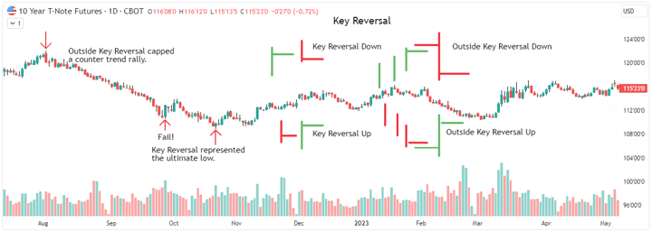Outside Key Reversal: Adds a significant degree of reliability. This pattern opens higher, often leaving a gap, moves to a new high and reverses, not only closing below the prior close but completely overlapping the range of the prior bar. The pattern becomes stronger if the two days comprising the pattern are wide range days (spikes) or if the spike on the reversal day is extreme. The lower in the day’s range the bar closes and the higher the volume, the more compelling the reversal.
