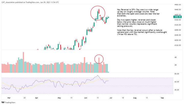 Key Reversal: In a bearish key reversal the market OPENS above the prior close, often leaving a gap, sets a new high, and then closes the day lower than the prior days close. The pattern becomes stronger if the two days comprising the pattern are wide range days (spikes) or if the spike on the reversal day is extreme. The lower in the day’s range the bar closes and the higher the volume the more compelling the reversal.